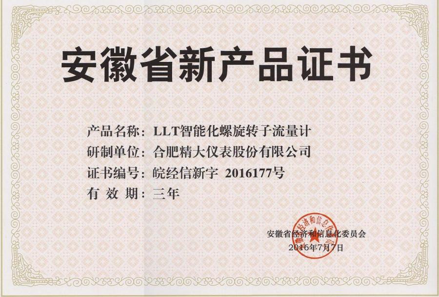 安徽省新產(chǎn)品證書(shū)(LLT型)
